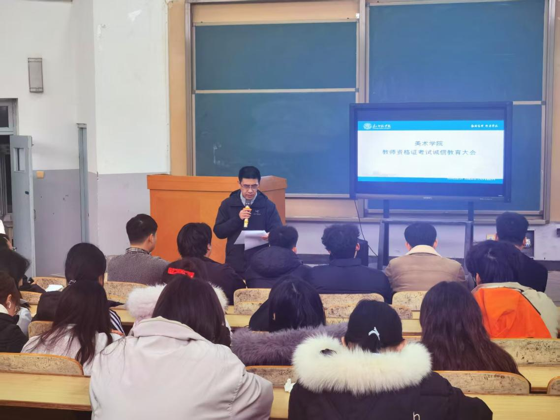 为严肃教师资格证考试纪律,强化学生诚信应考意识,保障考试公平公正、平稳有序开展,2026年3月5日,美术学院召开教师资格证考试诚信教育大会。美术学院党总支副书记王璐、班主任王敬东老师出席会议,全体备战教师资格证考试的学生参加,会议由张颖老师主持。